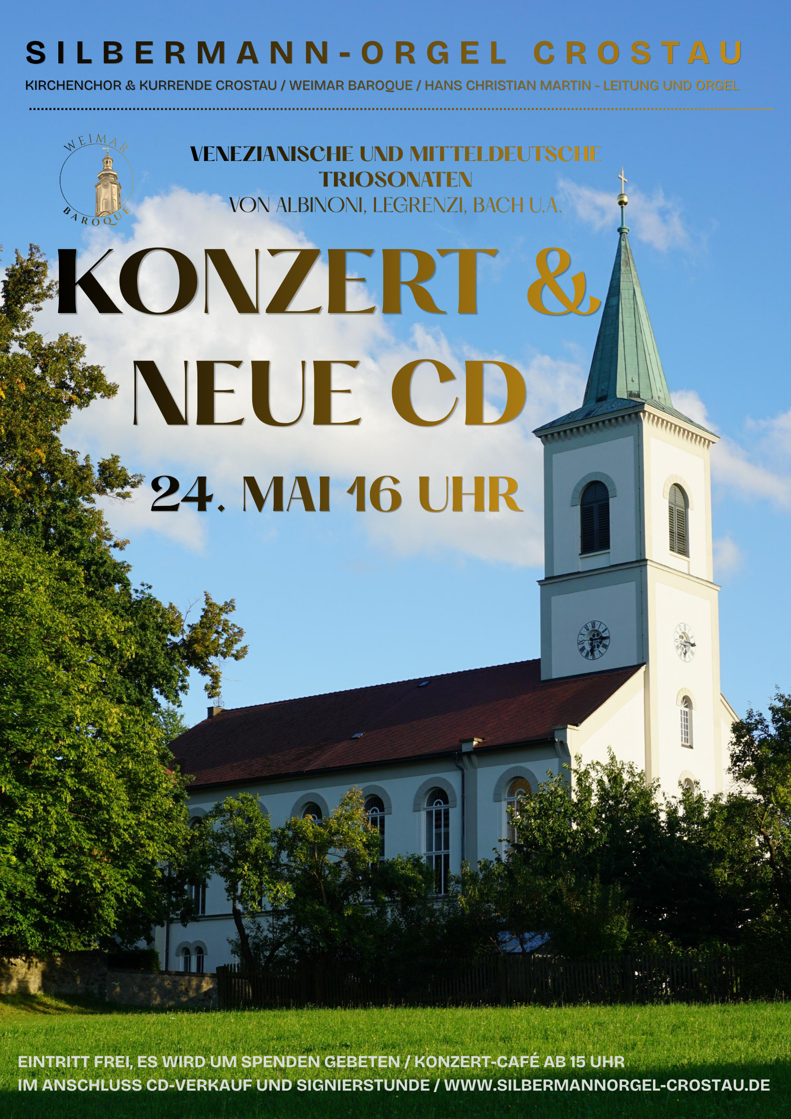 Endlich ist es soweit: Die Kirchgemeinde Crostau mit ihrer berühmten Silbermann-Orgel veröffentlicht ihre neue CD. Auf dem neuen Tonträger sind außer der Orgel der Crostauer Kirchenchor, die Kurrende und das Ensemble Weimar Baroque zu hören. Venezianische Kammermusik von Albinoni, welche dem Stifter der Silbermann-Orgel Graf Watzdorf gewidmet ist, steht im Mittelpunkt. Ergänzt werden die Stücke durch mitteldeutsche Orgel- und Chormusik.